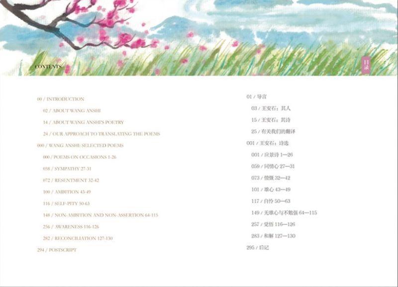 本书按照王安石的创作历程,将他的诗词分为八大类别,分别是:应景诗、同情心、愤慨、雄心、自怜、无雄心与不勉强、觉悟、和解。每个类别有一个总体介绍。每首诗都配了原创手绘彩色插图。插图兼具丰子恺画作的安静、超远、悲悯心、雅趣与老树画作的自在、洒脱。