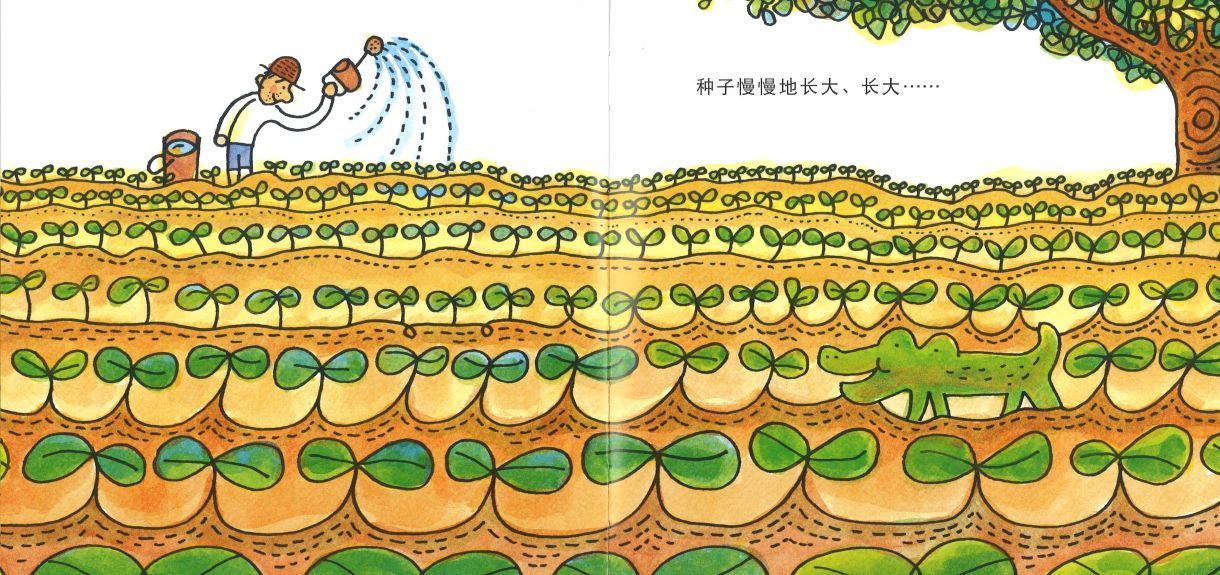 农夫在河边捡到了一只小鳄鱼,他们成了一起出门工作的好伙伴!他们一起整理田地、播种,撒下各种各样的青菜种子,农夫每天都摘各种好吃的青菜给小鳄鱼吃。有一天,医生来帮大家检查身体,有的小朋友肚子里有咕噜咕噜的怪声、有的便便拉不出来,而爱吃青菜的小鳄鱼的肚子又干净又健康,因为它的肚子里有很多绿色小精灵帮忙把坏细菌赶光光!
